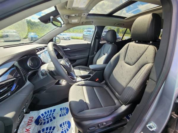 Experience Buick Package, Hands-Free Power Liftgate Package, (0 P) Moonstone Gray Metallic, All-Weather Floor Liners (LPO), Front License Plate Bracket, Floor matscolor-keyed and carpeted front (Deleted when the following LPOs are ordered: PDAPDHRIAVAVVYW.), DisplayECO drive assistance, StabiliTrakstability control system, Engine air filtration monitor, Wireless Apple CarPlay/Wireless Android Auto, Leather-Appointed Seat Trim, AirbagPassenger Sensing Systemsensor indicator inflatable restraintfront passenger/child presence detector (Always use seat belts and child restraints. Children are safer when properly secured in a rear seat in the appropriate child restraint. See the Owner's Manual for more information.), Moldingsupper side windowchrome roofline and gloss Black beltline, Speedometermiles/kilometersmiles odometer, Mechanical jack with tools, EngineECOTEC 1.3L Turbo (GM-estimated 155 hp [115 kW] @ 5 600 rpm / 174 lb-ft torque [236 Nm] @ 1 600 rpm FWD/AWD models), Seat adjuster2-way power driver lumbar control, Luggage rackside railsroof-mounted, Tail lampsLED, Cargo security coverrearstowable under rear cargo load floor, MOONROOFPOWERTILT-SLIDING, Keyless Open includes extended range Remote Keyless Entry, Keyless startpush button, Shift knobsatin silver and chrome, Teen Driver a configurable feature that lets you activate customizable vehicle settings associated with a key fobto help encourage safe driving behavior. It can limit certain available vehicle featuresand it prevents certain safety systems from being turned off. An in-vehicle report card gives you information on driving habits and helps you to continue to coach your new driver, Windowpower with driver Express-Up/Down, Brakeelectronic parking, Glassdeep-tinted, Lightinginteriordimming instrument panel cluster, MOONSTONE GRAY METALLIC, Power outlet120-voltlocated on the rear of center console, All-wheel drive with Driver Mode Selector, Steering wheelleather-wrapped 3-spokecolor-keyed with theft-deterrent locking feature, Brakes4-wheel antilock4-wheel disc, Fuel systemelectronicreturnless, Audio system feature6-speaker systemenhanced performance with amplifier, Bumperfront with chrome accents (Replaced with (VHU) front sport bumper when (GFC) Sport Touring Package is ordered.), LATCH system (Lower Anchors and Tethers for CHildren) for child restraint seatssecond row2 lower anchors for outboard seating positions only3 top tether anchors for all 3 seating positions, LICENSE PLATE BRACKETFRONT, Engine controlstop/start system, Daytime Running LampsSignature LED, Seat belt3-pointfront passenger with load limiter and pretensionersheight adjustable, Theft-deterrent systemelectricalunauthorized entry, Wiperrear intermittent, In-Vehicle Air Ionizer, Airbagsfrontal and knee for driver and front passengerseat-mounted side-impact and head-curtain for front and rear seating positions (Always use seat belts and child restraints. Children are safer when properly secured in a rear seat in the appropriate child restraint. See the Owner's Manual for more information.), Armrestrear center, MoldingsbodysideBlack Carbon Metallic (Not available with (GFC) Sport Touring Package. Replaced with (BRP) Dark Anderson Silver Metallic bodyside moldings when (GP5) White Frost Tricoat exterior color is ordered.), Memory settings recalls 2 'driver' presets for 8-way power driver seat and outside mirrors, Brake lining wear indicator, Lightinginteriorroofrear courtesy, Steering columntilt and telescopicadjustable, 3 years of OnStar & Connected Services Plan Access the entire suite of OnStar Safety & Security Services and Connected Services. For retail customersthis includes the OnStar Guardian appconnectivity for available In-Vehicle AppsIn-Vehicle Wi-Fi Hotspot data and Remote Access through the myBuick mobile app. Fleet customers will receive OnStar Vehicle Insights instead of Remote Access (Standard on models built after August 312022. Eligible vehicles receive 3-years of the OnStar and Connec, Gloveboxdual, LPOALL-WEATHER FLOOR LINERS, Following Distance Indicator, Audio system8' diagonal Buick Infotainment System includes multi-touch displayAM/FM stereoBluetooth streaming audio for music and most phones and Wireless Apple Carplay/Wireless Android Auto for compatible phones, Horndual note tone, Automatic Emergency Braking, Knee bolsterdriver and front passenger, Defoggerrear-windowelectric, Seatsheated driver and front passenger (Beginning with start of productionvehicles will be forced to include (00V) Not Equipped with Heated Driver and Front Passenger Seatswhich removes heated driver and front passenger seats. See dealer for details or the window label for the features on a specific vehicle.), Axle3.17 final drive ratio, Seatsfront bucket, Liftgatemanual, Seat belts3-pointrearall seating positions, Windowspowerrear with Express-Down, Map pocketfront passenger seatbacklateral mesh, Tirecompact spare 16' (40.3 cm)located under cargo floor, Coolant protectionengine, SEATSFRONT BUCKET(STD), Consolefloorwith armrest, Tire Pressure Monitoring Systemmanual learn (Does not monitor spare tire.), EBONY WITH EBONY INTERIOR ACCENTSLEATHER-APPOINTED SEAT TRIM, AUDIO SYSTEM8' DIAGONAL BUICK INFOTAINMENT SYSTEMincludes multi-touch displayAM/FM stereoBluetooth streaming audio for music and most phones and Wireless Apple Carplay/Wireless Android Auto for compatible phones (STD), Brakesfront and rearelectric, Tires225/55R18 all-seasonblackwall, Windshieldsolar absorbing, Door lockspower with lockout protection, Visorsdriver and front passenger illuminated vanity mirrorscoveredsliding, Seat adjusterfront passenger 8-way power with 2-way manual recline, QuietTuning Buick exclusive process that consists of acoustically enhanced windshield and side glassalong with numerous noise canceling acoustic treatments to reduceblock and absorb noise and vibration to create a quiet interior cabin, Windowpower with front passenger Express-Down, Noise control systemactive noise cancell