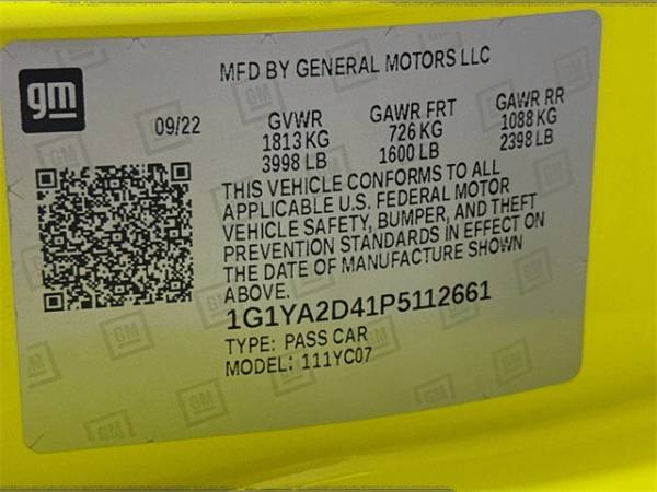 Clean CARFAX. Accelerate Yellow Metallic 2023 Chevrolet Corvette Stingray 1LT RWD 8-Speed Dual Clutch 6.2L V8 10 Speakers, 4-Wheel Disc Brakes, 8-Way Power Driver Seat Adjuster, 8-Way Power Passenger Seat Adjuster, ABS brakes, Air Conditioning, Alloy wheels, AM/FM radio: SiriusXM, Apple CarPlay/Android Auto, Automatic temperature control, Battery Protection Package, Body-Color Removable Roof Panel, Bose Premium 10-Speaker Audio System Feature, Brake assist, Bright Red-Painted Calipers, Bumpers: body-color, Carbon Flash Metallic Painted Outside Mirrors, Carbon Flash Metallic-Painted Outside Mirrors, Compass, Competition Sport Bucket Seats, Delay-off headlights, Driver door bin, Driver vanity mirror, Dual front impact airbags, Dual front side impact airbags, Electronic Stability Control, Emergency communication system: OnStar and Chevrolet connected services capable, Four wheel independent suspension, Front anti-roll bar, Front Bucket Seats, Front Center Armrest, Front dual zone A/C, Front License Plate Bracket, Front reading lights, Fully automatic headlights, GT1 Bucket Seats, HD Radio, Heated door mirrors, Illuminated entry, Leather Shift Knob, Leather steering wheel, Low tire pressure warning, Low-Profile Rear Spoiler & Front Splitter, Mulan Lthr Seating Surfaces w/Perforated Inserts, Occupant sensing airbag, Outside temperature display, Overhead console, Panic alarm, Passenger door bin, Passenger vanity mirror, Power door mirrors, Power driver seat, Power passenger seat, Power steering, Power windows, Preferred Equipment Group 1LT, Premium audio system: Chevrolet Infotainment 3 Plus, Radio data system, Radio: Chevrolet Infotainment 3 Plus System, Rear anti-roll bar, Rear window defroster, Remote keyless entry, SiriusXM Radio, Speed control, Speed-sensing steering, Sport steering wheel, Steering wheel mounted audio controls, Sueded Microfiber-Wrapped Steering Wheel, Tachometer, Telescoping steering wheel, Tilt steering wheel, Traction control, Trip computer, Turn signal indicator mirrors, Variably intermittent wipers, Voltmeter, Wheels: 19" x 8.5" Fr/20" x 11" Rr Bright Silver, Wheels: 19" x 8.5" Fr/20" x 11" Rr Gloss Black.Please reach out to schedule an appointment for a viewing @ 518-458-7700 www.denooyerchevrolet.com. Recent Arrival! Odometer is 4847 miles below market average!Awards: * Car and Driver 10 BestCar and Driver, January 2017.